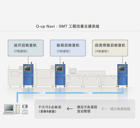 在SMT生产线的丝印(P)、贴装(Z)、回流焊接(S)的各工程中安装采用图像传感的检查机。由于在发生不良时,可以推测不良的原因,并通过对各 PZS工程的检查结果(图象信息和数值信息)的3方面核对来分析不良的详细内容,因而能够迅速采取改善措施。不再仅仅将检查机用于“检查=剔除不良品”,而是灵活运用其收集到的生产线的质量数据,实现“从检查到工程改善”的革命性系统,这就是Q-up Navi。