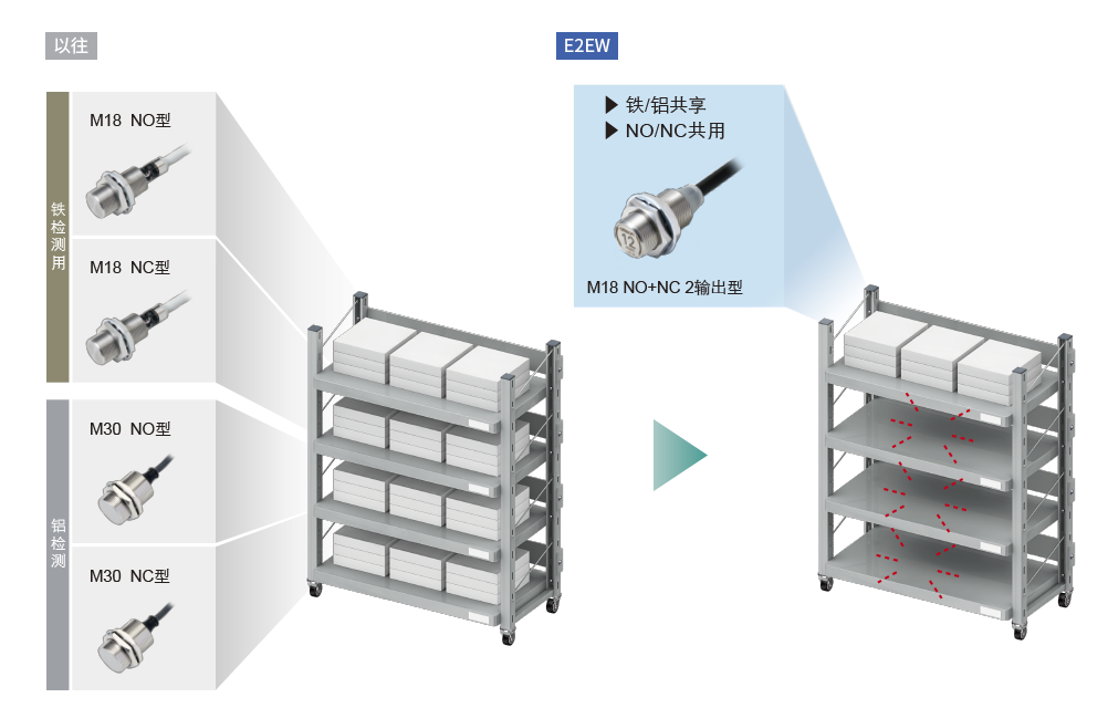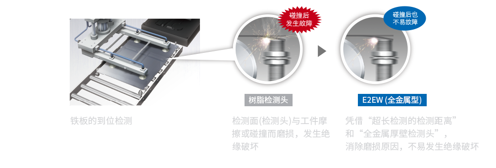 过去,为了防止检测错误,只能采取有接触风险的传感器安装设计,E2EW则拥有超长检测的检测距离,即使隔开一定距离也不会发生检测错误,从而实现减少了接触风险的有余量的安装设计。