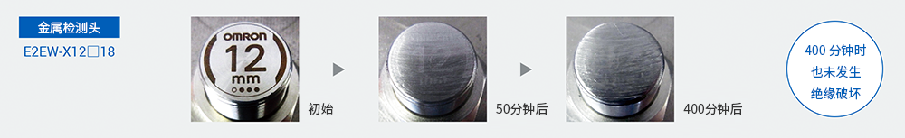 以130rpm的转速用不锈钢刷进行耐磨损性测试的结果显示,树脂检测头在50分钟后发生绝缘破坏,而金属检测头在400分钟后也未发生绝缘破坏。