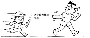 A虽然个头小, 但是依然紧握接力棒, 并把接力棒移交给大人B。这就是接力。