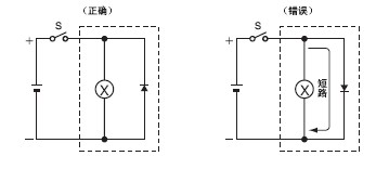 (3) 关于线圈应注意以下几点: 在DC 操作继电器中, 带动作表 示、带浪涌吸收用二极管继电器及保持继电器的情况下有极 性。极性弄错可能会导致元件损坏、动作不良, 敬请注意。 如果在AC操作继电器上外加DC电压,线圈发热,可能造成烧 损。相反如果在DC操作继电器上外加AC电压,可动铁片反复 振动, 不能正常动作。