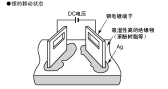 银的移动现象是银端子(电极)间长时间施加直流电压,在湿度及 氧化还原环境的条件下,称为银移动。随着这种现象的进行,可能 会降低绝缘性,偶尔在电路间发生短路等故障。