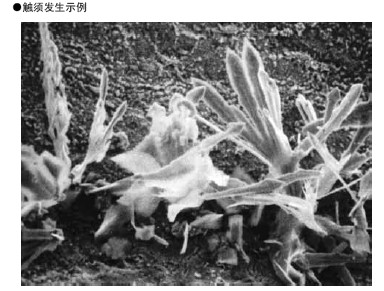 若长期保存电镀的零件, 可以看到在表面长有针状的结晶。由于 该结晶像触须或者形状与猫的胡须相似, 所以称为触须线。根据 该金属结晶的长度, 有时会造成电路间的短路故障。