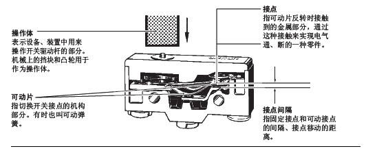 限位开关 用语说明■一般用语限位开关: 为保护小型开关不受外力、水、油、尘 埃等的侵害而将其装入金属外壳或者塑料 外壳中的开关。(以下称开关) 额定值一般指作为开关特性和性能的保证标准的 量, 如额定电流, 额定电压等, 以特定 的条件为前提。 有接点指利用接点的机械开合来实现开关的功能。 接触形式根据各种用途构成接点的电气输入输出电路的方式。 树脂固定(塑封端子)用导线对端子部分完好配线, 通过充填树 脂使该部分固定, 消除暴露在外的带电部 分, 提高密封性的一种方法。 ![]() ■与结构、构造相关的用语 ![]() ■关于寿命的用语 机械寿命 将过行程(OT)设为规格值,在未通电状态下的开关寿命。 电气寿命将过行程(OT) 设为规格值,在额定负载(阻性负载)下的开关寿命。 FP (自由位置)没有施加外力时驱动杆的位置。 OP (动作位置)向驱动杆施加外力,使可动接点刚从自由位置的状态开始反转时的位置。 TTP (总行程位置)驱动杆到达驱动杆停止档时的位置。 RP (返回位置)减少对驱动杆的外力,使可动接点刚从动 作位置反转到自由位置状态时驱动杆的位置。 OF (动作力)为了从自由位置移动到工作位置所必须给 驱动杆施加的力。 RF (回复力)为了从总行程位置移动到回复位置,必须 对驱动杆施加的力。 PT (预行程)驱动杆从自由位置到动作位置的移动距离 或移动角度。 OT (过行程)驱动杆从动作位置到总行程位置的移动距 离或移动角度。 MD (应差行程)驱动杆从动作位置到返回位置的移动距离 或移动角度。 TT (总行程)驱动杆从自由位置到总行程位置的移动距 离或移动角度。 对目录中使用的上述规格用语说明如下。 EN60947-5-1「电气机械控制电路设备」的EN规格。和IEC60947-5-1的内容相同。