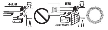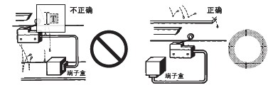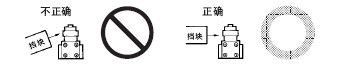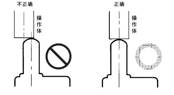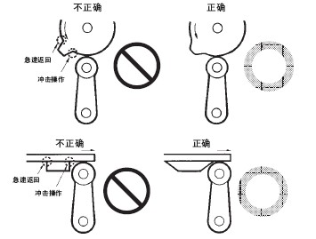 ●关于连接 ·请不要在1个开关的接点上连接异极、异种的电源。 ·在电路设计时请不要在接点间加电压。(可能导致混触熔化) ·即使在发生异常情况时, 也不要出现短路的电路。(可能导致导电部位的熔断) ·开关用于电子电路(低电压· 低电流) 1. 接点的振动、震颤会带来问题时,请采取下面的措施。 ●关于使用环境 ·请不要在有引火性气体、爆炸性气体等环境中单独使用开关。 ·限位开关也会由于在室外或特殊的切削油的关系导致开关材质变质及劣化, ·请不要在有热水(+60℃以上) 的地方和水蒸气中使用。 ·操作人员不小心将开关安装在易发生误动作或事故的地方时,请加装外罩。 ·开关受到连续的振动和冲击时,产生的磨损粉末可能导致接点接触不良和动作失常、耐久性下降等问题。 ●关于定期检查和定期更换 ·在一直按下的状态下, 如果开关频率较低(1次以下/日), 则可能会由于零件的劣化导致复位不良。 ●关于开关的保管 ·请避免在恶性气体(H2S、SO2、NHO3、Cl2等) 和有尘埃、高温多湿的环境中存放开关。 ●关于耐气候、耐寒、耐热规格 为了提高耐气候、耐寒、耐热性能, 使用了硅橡胶, 硅橡胶部分情况下可能产生硅气体(常温下可能发生, 高温下产生量会进一步增加) 。 这种气体通过电弧能量反应, 会生成二氧化硅(SiO2) 。二氧化硅(SiO2) 不断堆积在接点上, 会发生接触障碍, 可能影响设备的正常运行。 ●关于室外使用 ·在有泥水、粉尘的地方, 请使用机械部位密封的橡皮帽限位开关。 ●关于操作 ·为避免开关的驱动杆急速返回或受到冲击, 请考虑操作体(凸轮、挡块等) 进行操作。 ·在旋转运动、直线运动时也必须在开关的驱动杆上施加正常的载荷。 如下图所示, 挡块触到摆杆时, 动作位置将无法稳定。 ·请不要在开关的驱动杆上施加偏载荷, 或者引起局部磨擦。 ·如果从斜面向开关的驱动杆(滚珠) 上施加载荷, 可能会造成驱动杆和旋转轴的变形、折损, ·请设置驱动杆不超过过行程(OT)。过行程(OT)超过限制的话,可能引起故障。 ·过行程过大时, 可能会诱发早期的故障。因此在安装时必须进行调整, ·在针状按钮型中, 按钮的行程和操作体的行程必须在一条垂直线上。 ·请配合驱动杆的特性使用开关。 ·请不要对驱动杆进行加工而导致动作位置的变化。 ●挡块的设计 关于挡块的速度及角度与驱动杆的关系 <滚珠摆杆型驱动杆> (1)挡块不会越过驱动杆的情况下