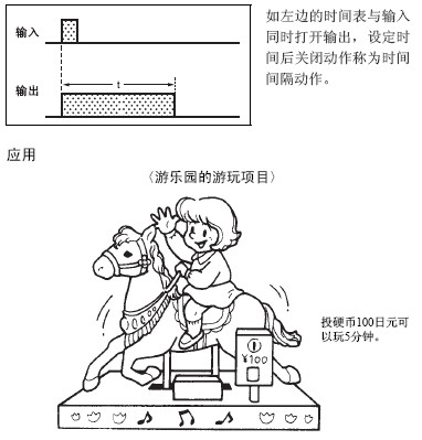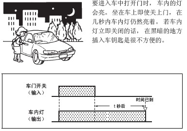 打开车门, 打开门开关的同时, 车内灯也亮起来。关上门即使门 开关关闭, 车内灯仍就会亮着。即设定时间延迟后车内灯熄灭。 像这样在输入同时打开输出, 输入关闭后开始计算设定时间, 设 定时间后定时器的接点切换, 输出关闭的动作称为OFF延迟动 作。