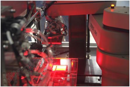 机器人抓取零件后,连续移动通过向上拍照的相机视野,相机通过触发信号捕捉零件照片,获取零件位置来进行位置补偿。