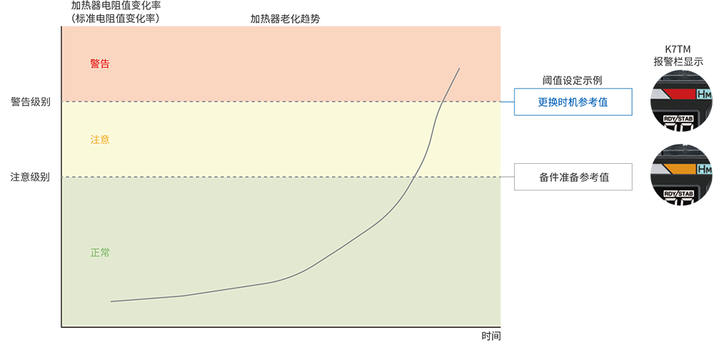 加热器状态监视器K7TM能够细致、合理地定期测量金属电阻加热器的电阻值,按照时序监视因老化引起的电阻变化,不受控制方式或加热器温度特性的限制。因此,对于通常采用事后维护或定期维护的加热设备,可以通过检测加热器电阻的长年变化,实现预测性维护。