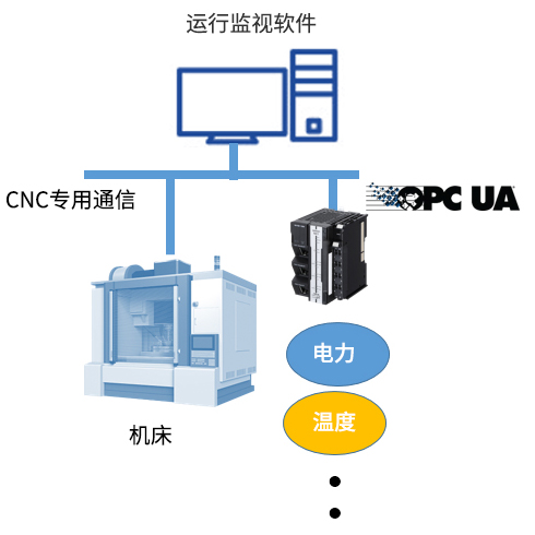 金属部件的加工生产线大量引进了配备CNC的机床,采用OPC UA的目的,是要统一收集机床运行信息以及PLC所控制的外围装置的信息、电力及温度等运行环境信息,并使其实现可视化。采用要点是能够利用同一个机制来收集并管理CNC和PLC双方的信息。