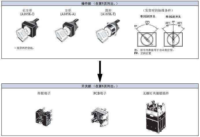 下表中给出了用于订购成套单元的型号。一套的组成有选择器、开关和两把钥匙。
