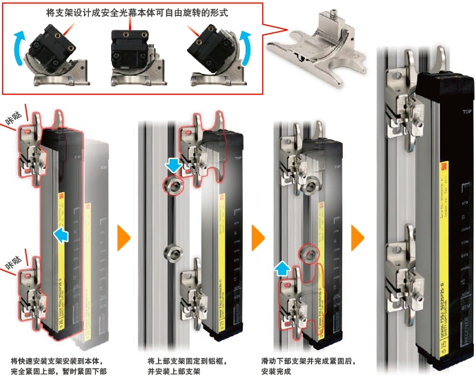 借助较少的配线数、安装到铝框的快速安装支架以及激光校准器进行的简易光轴调整,安装工时缩减约为本公司以往产品的1/2。响应速度固定,简化安全距离的计算。