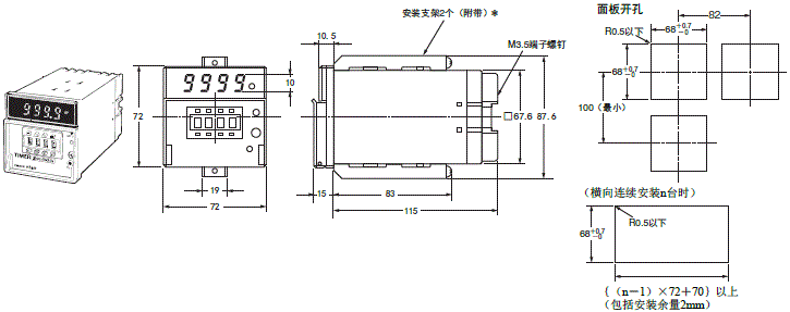 注1. 标准面板开孔如右图所示。(依据DIN43700) 2. 可以安装在板厚1~5mm的场所。 3. 安装时,请使用附带的安装支架将其安装牢固。 补充订购支架时,型号为Y92H-5 (2个装)。