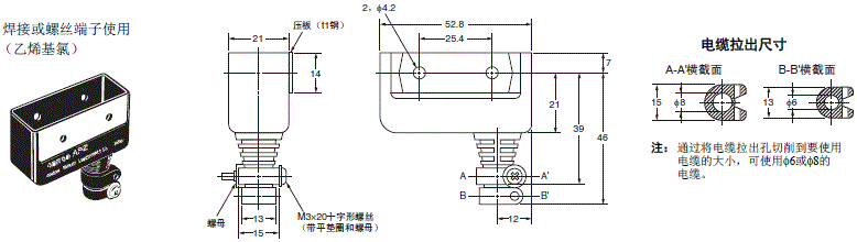 型号、图解、图纸为螺丝端子(-B) 的例子。焊接端子省略了型号末尾的“-A”, 端子的详情请参见上述的“端子的种类” 项目。
