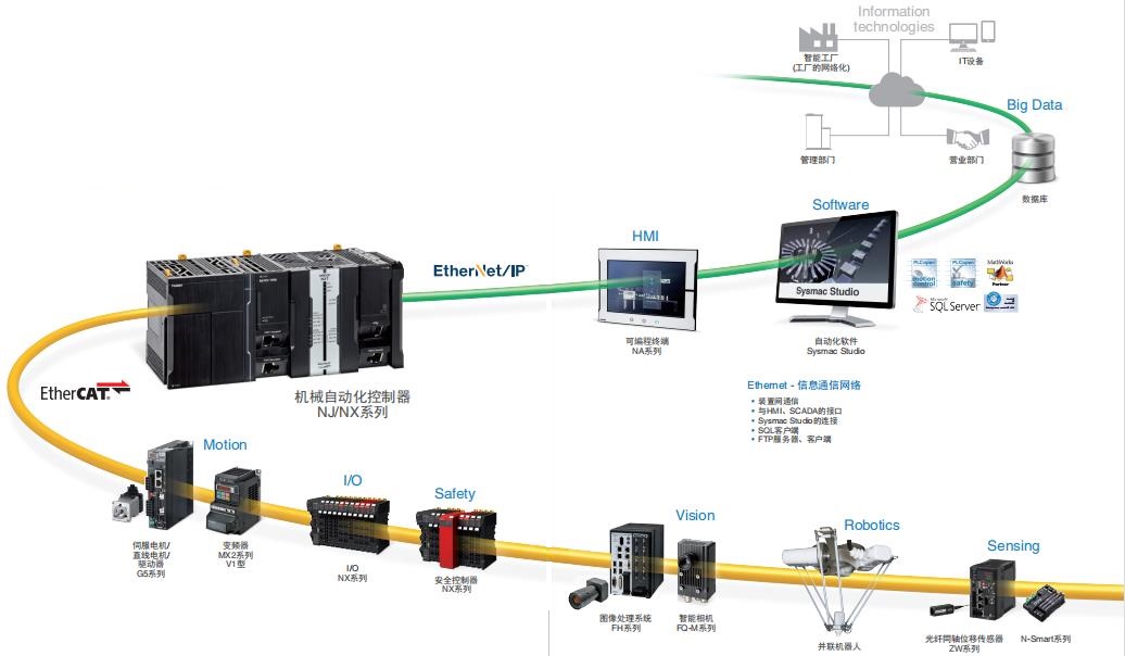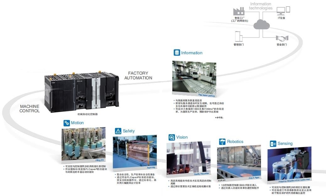 Sysmac 自动化平台基于理念,将机器内的控制网络所连接的设备与制造现场的信息通信网络无缝连接。
