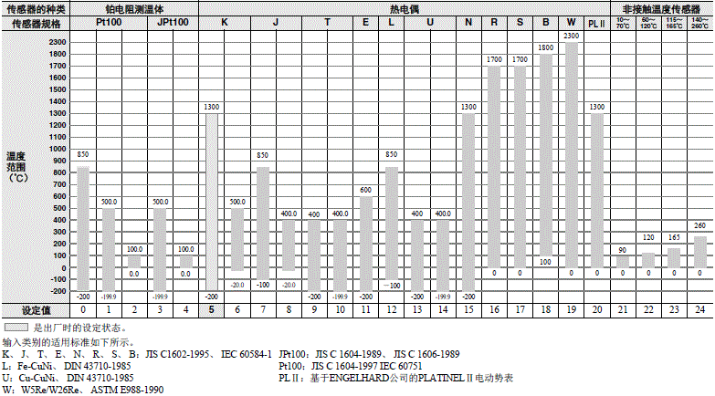 热电偶 :K、J、T、E、L、U、N、R、S、B、W、PLⅡ 铂电阻测温体 :Pt100、JPt100 非接触温度传感器(ES1B):10~70℃、60~120℃、115~165℃、140~260℃ 模拟量输入 电流输入:4~20mA、0~20mA 电压输入:1~5V、0~5V、0~10V、 0~50mV(0~50mV仅E5CC-U可使用(2014年5月起生产)) |