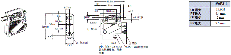 2. 1VAP2-6也可用于SPDT接点。如果需要SPDT接点,请使用以下型号订购。(内置开关是V-15-1B6。) 1VAP2-6 (V-15-1B6)