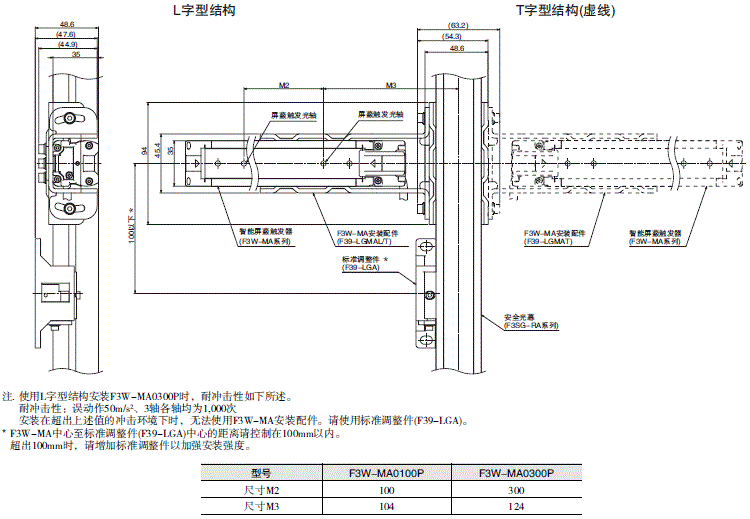 在F3SG-RA上安装F3W-MA安装配件(F39-LGMA□)和标准调整件(F39-LGA)时