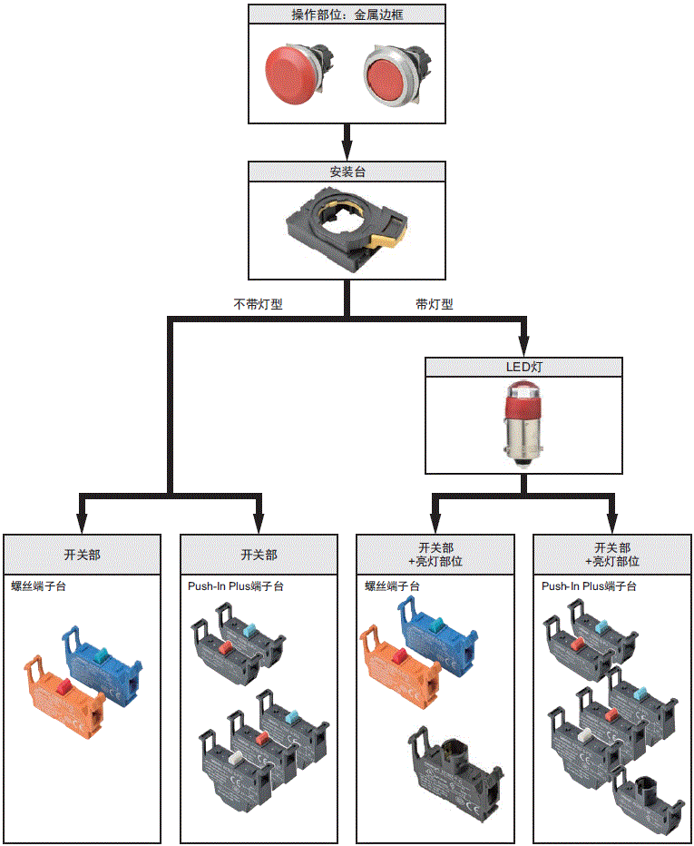 操作部位、LED灯、安装台、开关部可以单独订购。如果需要购买成套组合型号中不提供的单元,可将这些部件单独订购后组装使用。也可将其作为维护部件库存。