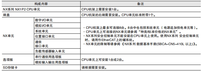 CPU机架由NX系列 NX1P2 CPU单元和NX单元的各构成单元、端盖构成。 NX单元的连接数最多8台。