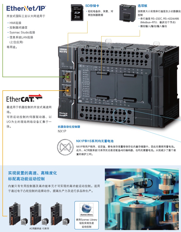 • 含单轴位置控制在内,可使用EtherCAT轻松连接最多8轴的伺服系统。