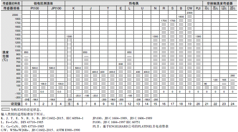 热电偶:K、J、T、E、L、U、N、R、S、B、C/W、PLⅡ 铂电阻测温体:Pt100、JPt100 非接触温度传感器(ES1B):10~70℃、60~120℃、 115~165℃、140~260℃ 模拟输入 电流输入 :4~20mA、0~20mA 电压输入 :1~5V、0~5V、0~10V |