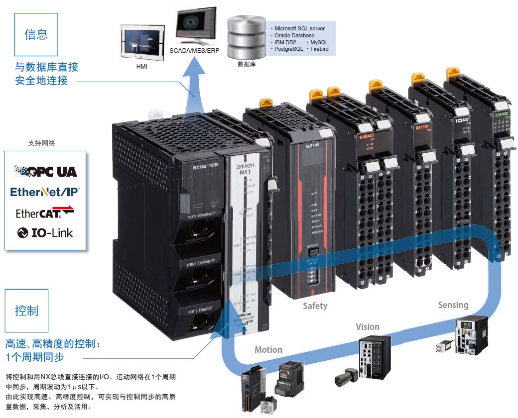 信息活用,加速其发展。将控制和信息融合的控制器NX1可以与各种输入、控制、输出、安全、机器人产品组合,以解决多样问题,实现丰富应用。