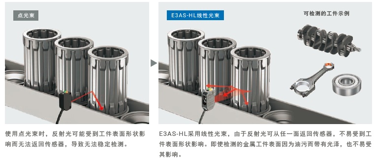 但若采用E3AS-HL,则不易受到复杂形状、颜色和光泽的影响,实现稳定检测,从而减少重新设计所需的工时。