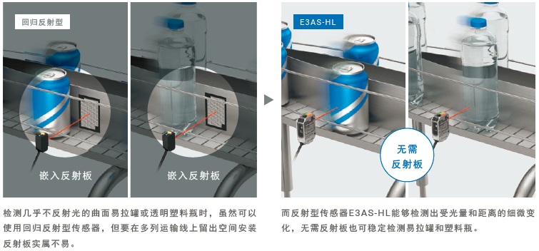 对于难检工件或长距离检测,虽然可以使用回归反射型传感器,但随着设备日益精密、复杂,安装空间受到限制,需要花费大量工时进行设计。若采用E3AS-HL,则无需反射板。