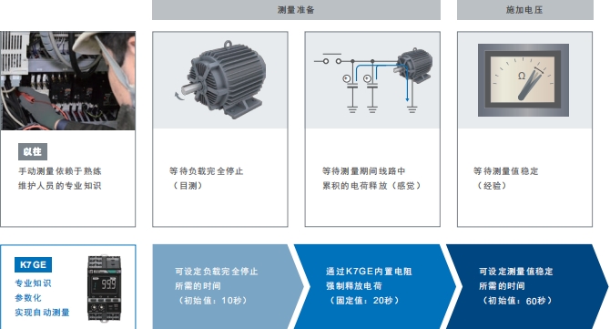 以往要测量绝缘电阻,必须停止设备并拆除配线,在这种情况下,如要提高测量频率,必须调整生产并保证测量仪表与工时。
