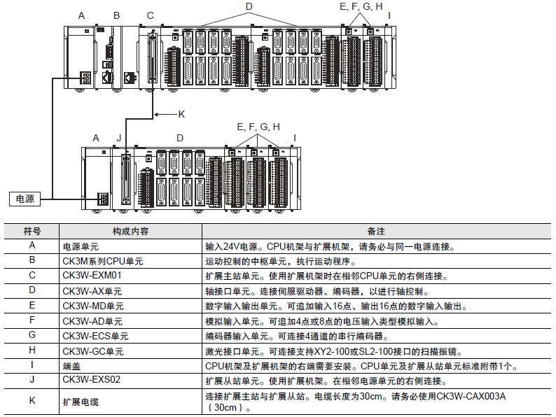 CPU机架的CK3W单元构成包括电源单元、CPU单元、CK3W-AX单元、CK3W-MD单元、CK3W-AD单元、CK3W-ECS单元、CK3W-GC单元、端盖。