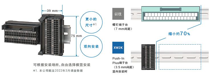更小尺寸*1,实现节省控制柜空间和作业工时的小型连接器端子台 *1. 据本公司2022年3月调查