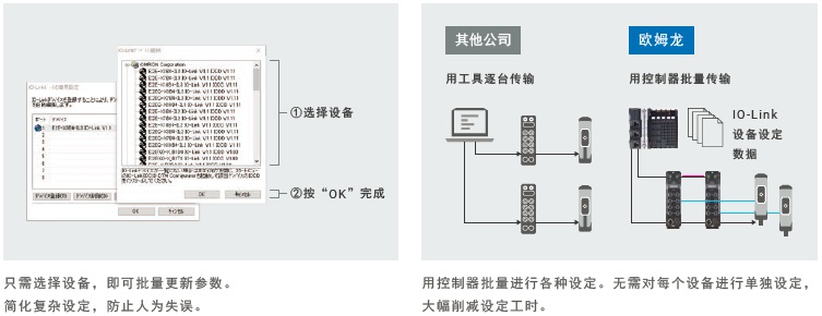 使用设定工具可一次性自动设定IO-Link参数,还可以从控制器批量传输远程终端设定和IO-Link设备设定。这些功能可将设定时间缩短90%*1。