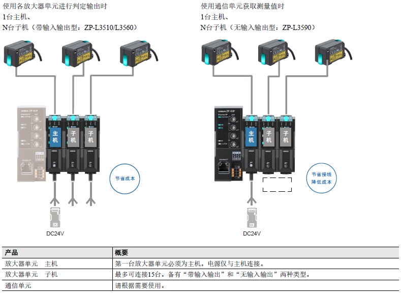 放大器单元产品阵容包含主机和子机,使用的传感器数量较多时,可通过组合子机构建节省成本和接线的结构。最多可连接16台设备。(1台主机、15台子机)