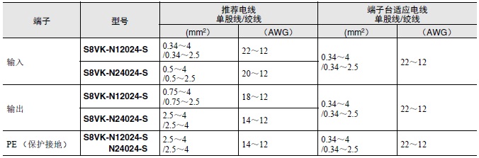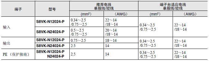 • 连接S8VK-N时请使用下列线材,以防止由于负载异常引起冒烟或起火。