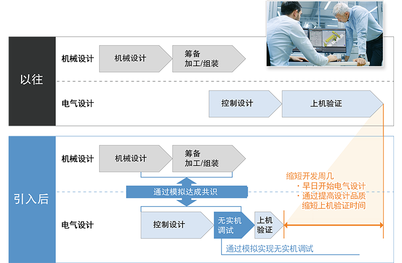 在设备开发时创建的控制程序的动作,可以立即在虚拟环境中确认并对其进行验证。在设计阶段即可提高程序的精度,减少上机验证时的返工,缩短开发周期。