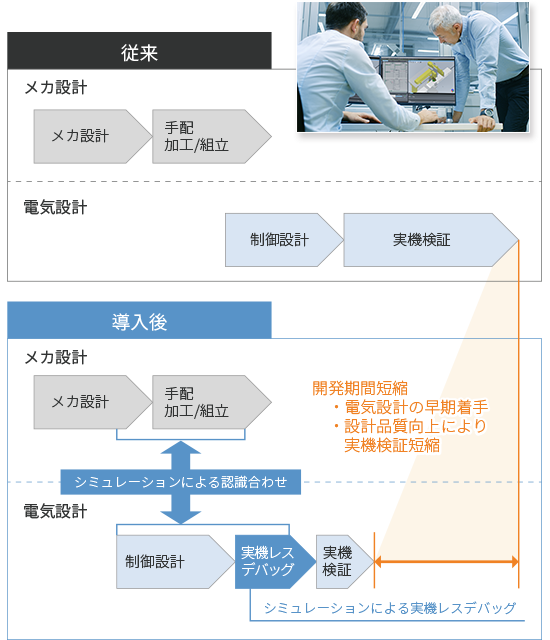 通过在工序设计时的可行性验证,活用机械设计者和电气设计者的共识,可提高开发上游的设计品质,并大幅提高客户的设备开发效率。