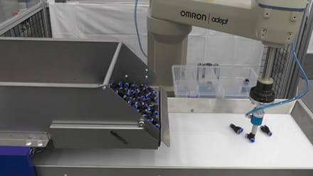 协作机器人“TM系列”可与零件送料器“AnyFeeder”配合,识别散装部件并进行指定处理。