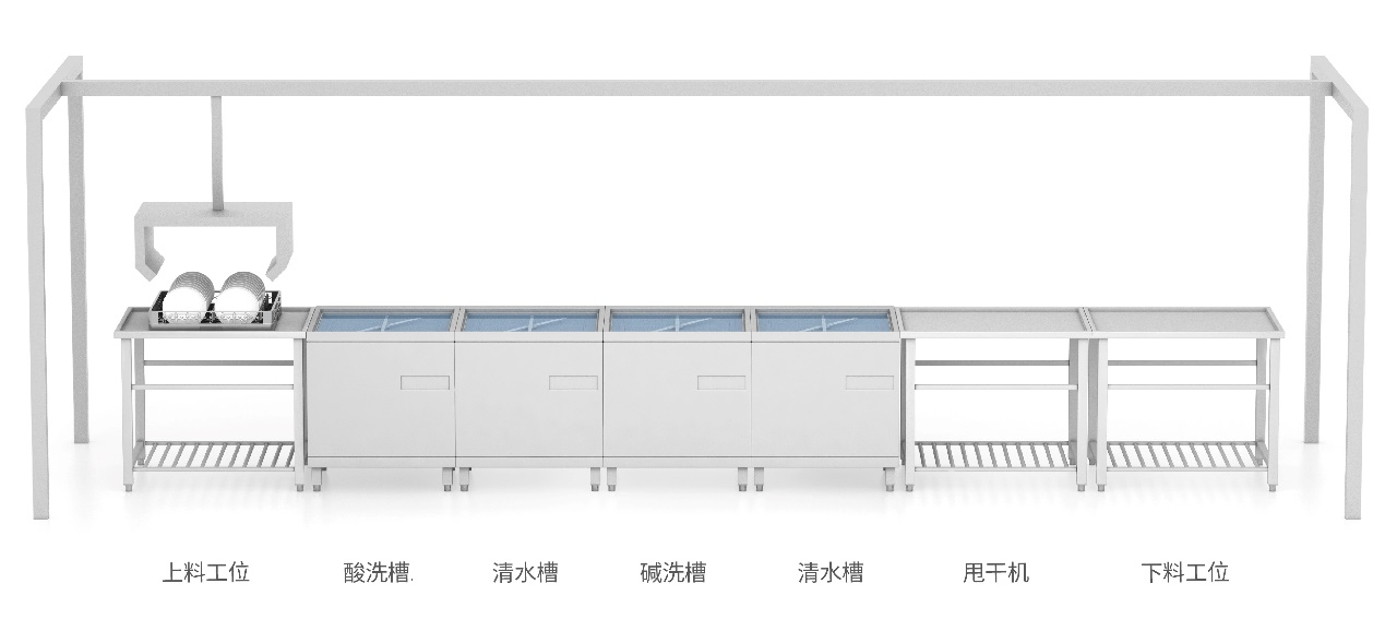 碳化硅晶圆槽式清洗甩干一体机,主要结构包括:上料工位、酸洗槽、清水槽、碱洗槽、、缺陷检测工位、甩干机和下料工位。