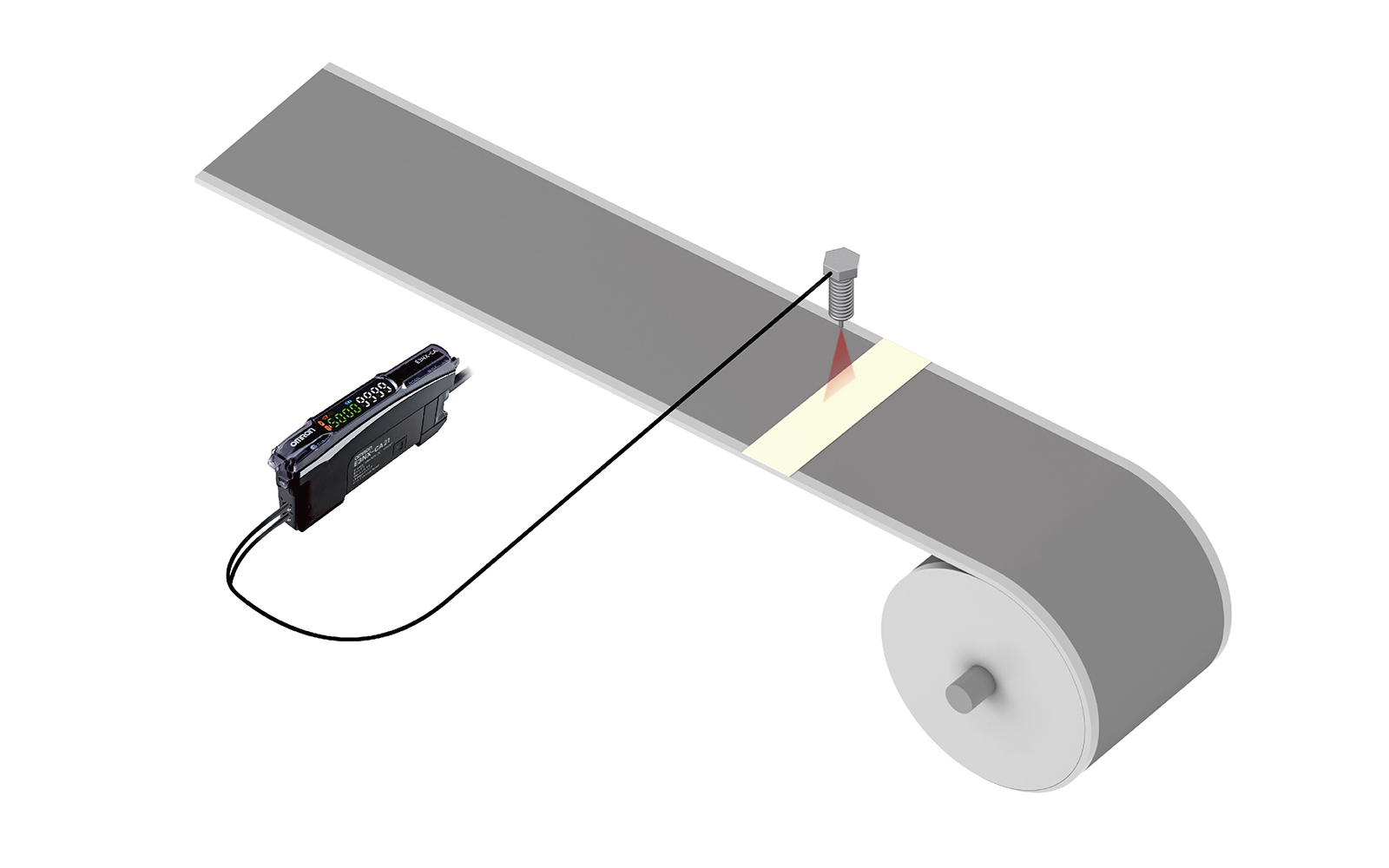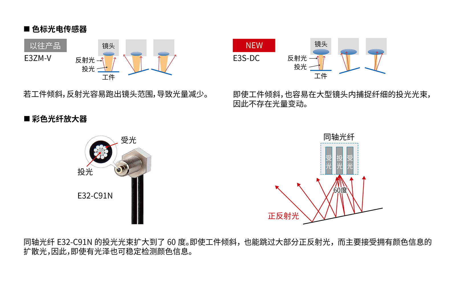 同轴光纤E32-C91N的投光光束扩大到了60度,即使工件倾斜,因同轴光纤单元的使用而实现了稳定检测有光泽的材料。