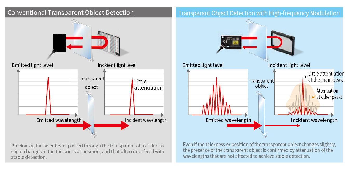 针对高透明度的物体检测(95%透明度薄膜),E3NC采用多波长的激光光源,通过不同波段光线的穿透与反射特性差异对透明体进行检测。
