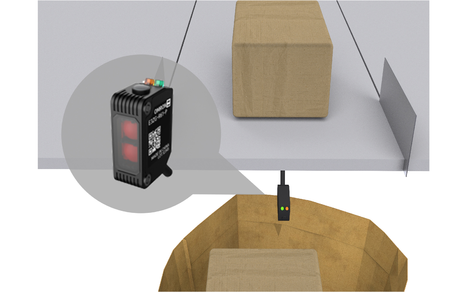 E3ZG-TF系列为TOF激光检测原理,检测距离1m,有效覆盖格口至快递袋的满袋标准位。此外,传感器不会受被测物体的颜色、材质、形状等属性而影响检测距离,可以稳定检测如黑色包裹、白色纸箱等色差较大的常用快递类型。