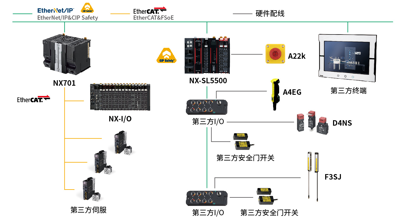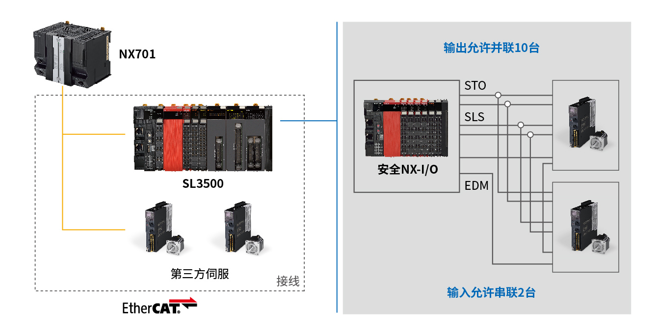 ■ 通过与第三方安全伺服输出并联、输入串联的方式,减少安全I/O点数,满足安全等级要求。