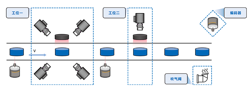 双工位独立检测瓶盖侧壁及瓶盖顶部,配合编码器触发,然后由PLC与机器界面记录NG瓶盖的位置进行打落,实现高速全视角瓶盖缺陷检测。