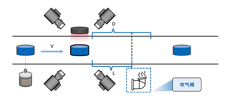 双工位独立检测,四个相机互成90°从侧面拍照检测瓶盖侧壁,单相机从上往下拍照检测盖顶,做到360°全视角检测,消除了鱼眼镜头带来的畸变问题。通过编码器触发方式,两个工位的NG(不良品)吹落口以编码器记录数据合并至一个吹落口,保证设备不受外部干扰能够高速运行。