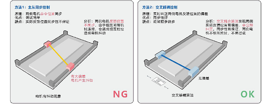 因此,我们采用交叉解耦控制,通过实时纠正两侧电机反馈位置的偏差,同步性有保证,两侧电机不相互拉扯,也不易过载。