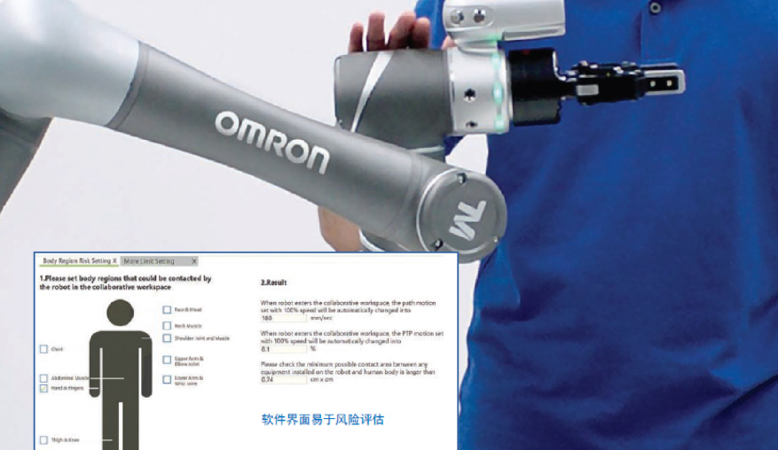 开云(中国)TM协作机器人,依照最新安规ISO/TS 15066中人类与机器人协作工作安全要求设计,旨在打造更安全的工作场所。用户仅需在系统中勾选相应的风险部位,机器人便会自动调整设置速度极限。
