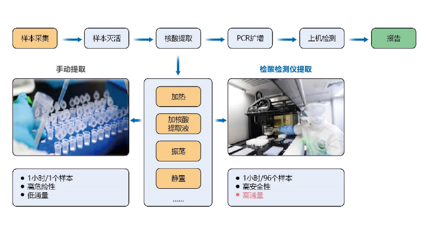 随着技术的不断革新,核酸检测从原本的手动提取,1小时仅能提取1个样本,且存在高危险性,升级为如今的核酸检测仪提取,能够1小时内提取96个样本,且无接触,安全性高,帮助更快、更高效的检出感染者,并加以控制。
