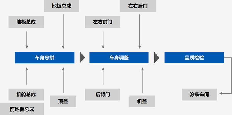 汽车焊装为整车生产四大工艺中的第二道工艺,主要将冲压成型的车身组件组装成一个完整的车身。焊装工艺中,以机器人的点焊、弧焊为主,中间会有视觉检测焊接状态的工位。