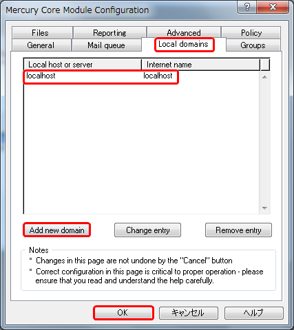 30.请点击「Local Domains」标签,通过「Add new domain」按钮在「Local host or server/Internet name」栏追加localhost。