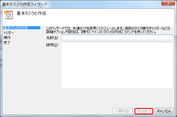当出现「基本任务的制作」的画面时输入「姓名(A)」及「说明(D)」,然后点击「下一步(N)」。(例:姓名:Mercury32 自动启动,说明:SMTP转送应用)